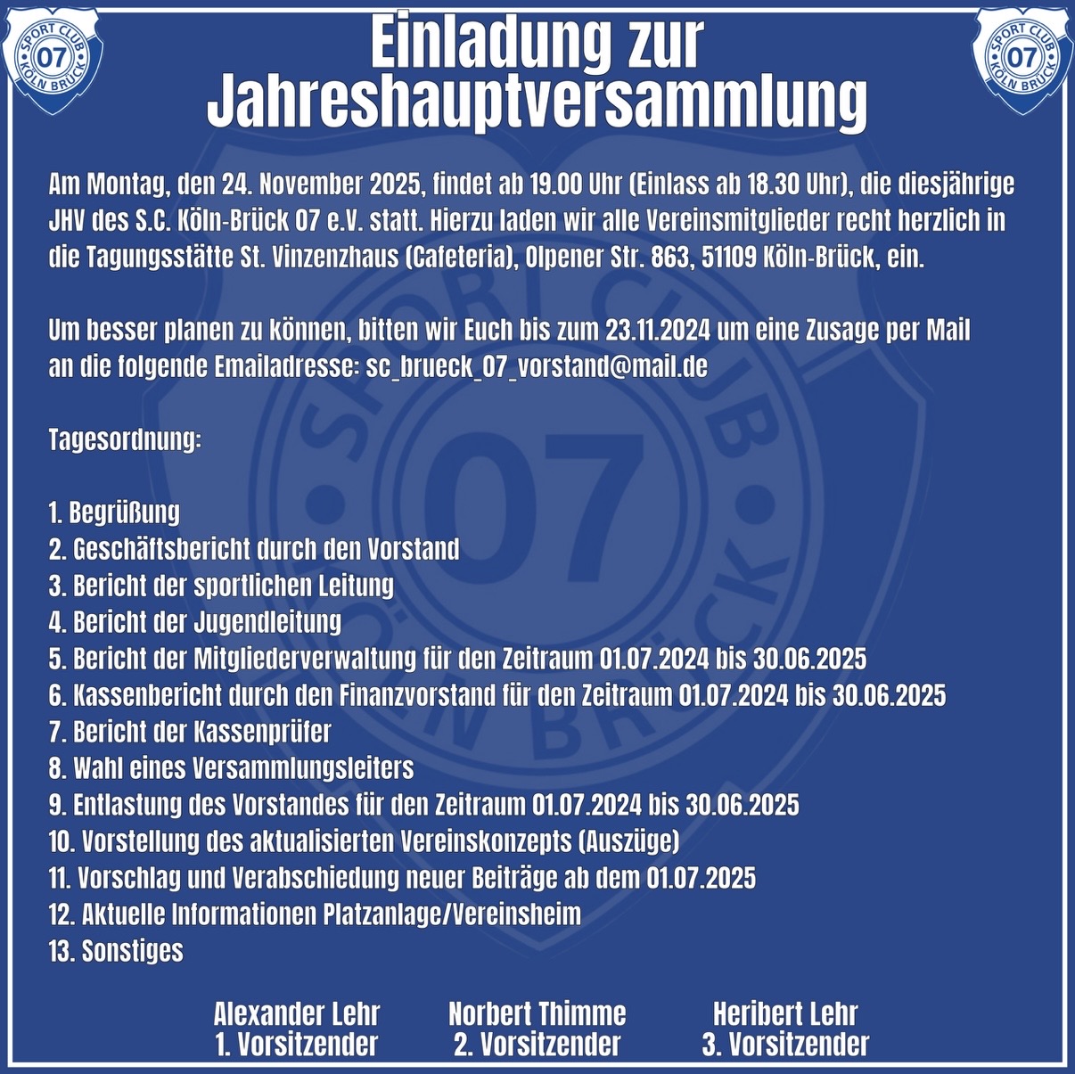 Am Montag den 24. November 2025 findet um 19 Uhr unsere JHV statt.